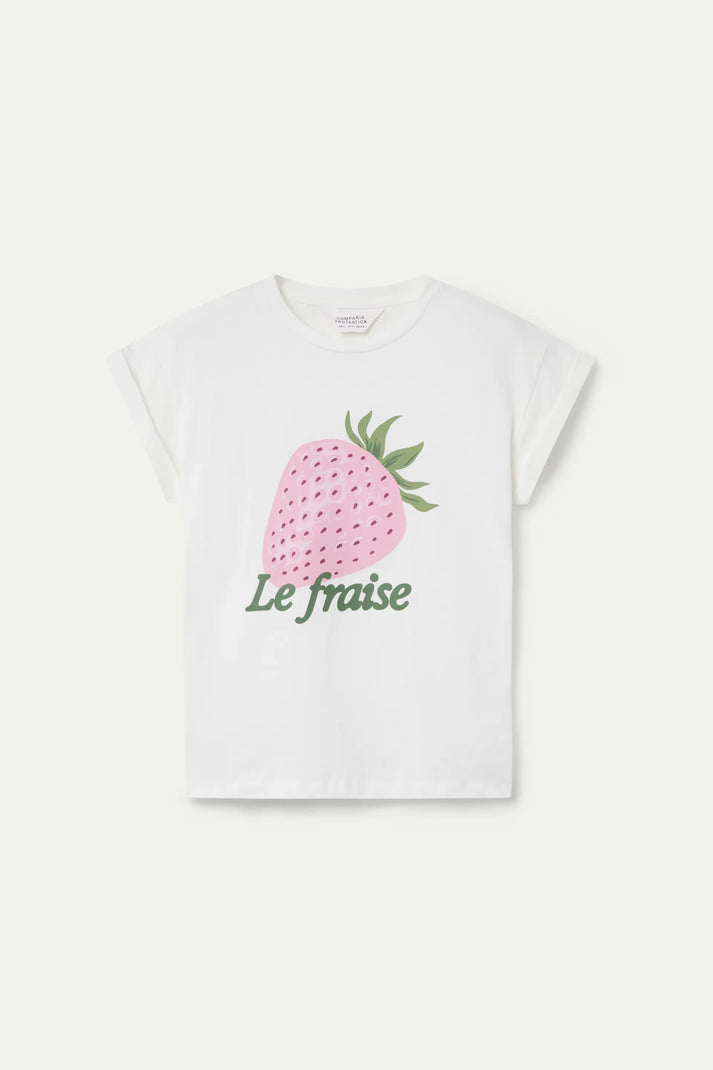 Camiseta con tejido 100% algodón de color blanco con estampado maxi Le fraise. Con cuello redondo y manga corta con vuelta. La modelo mide 179 cm y lleva la talla S.