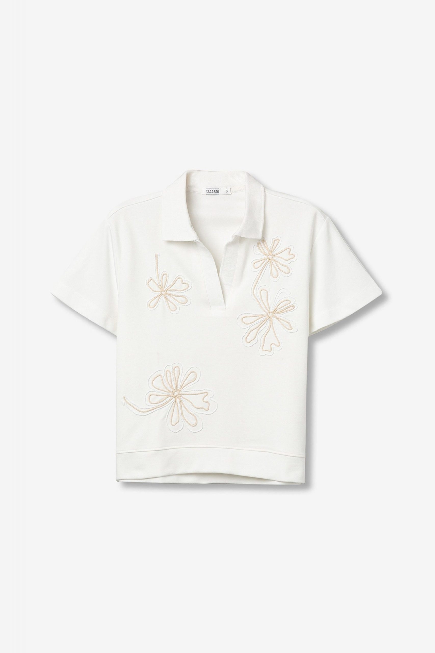 camiseta tipo polo con cuello en pico y bordados en color tierra 70% VISCOSE 26% POLYESTER 4% ELASTANE