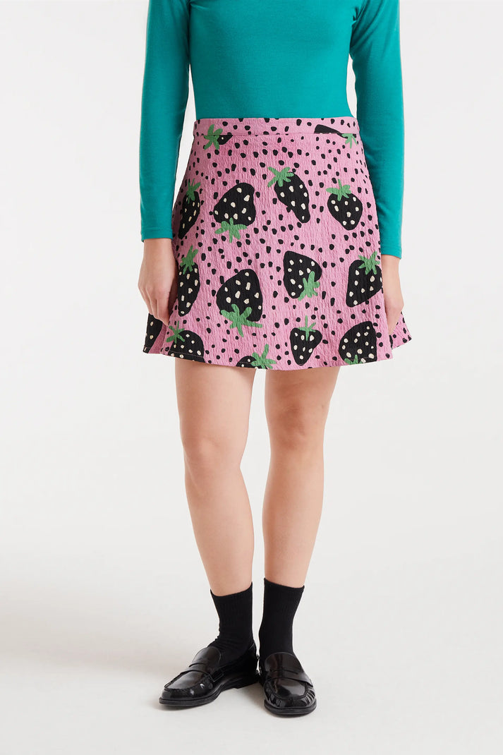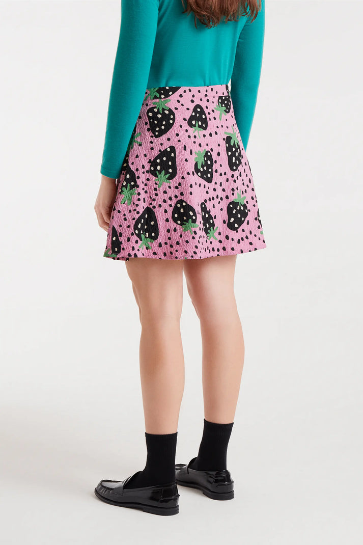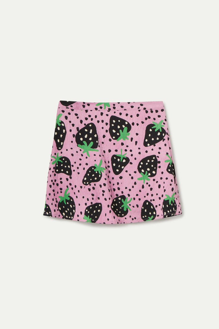 Falda corta con estampado Morango Big. Cintura fija de tiro alto. Cierre con cremallera invisible lateral. La modelo mide 178 cm y lleva la talla S.