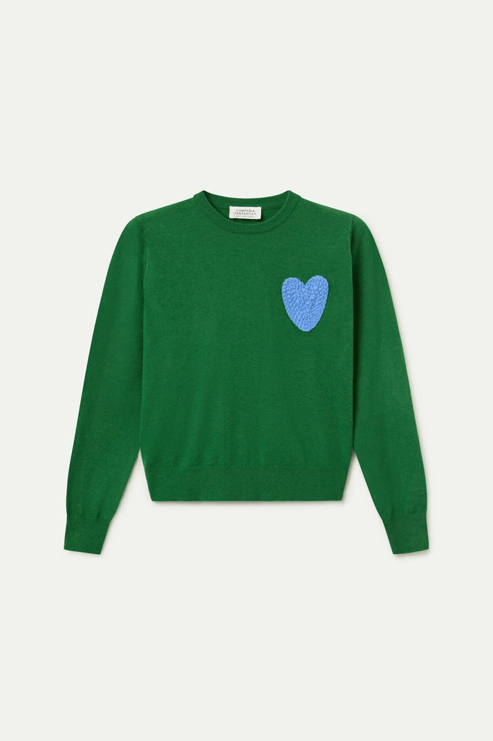 Jersey de punto de color verde con print bordado de corazón azul. Con cuello redondo y manga larga. Detalles con acabados en rib. La modelo mide 177 cm y lleva la talla S.
