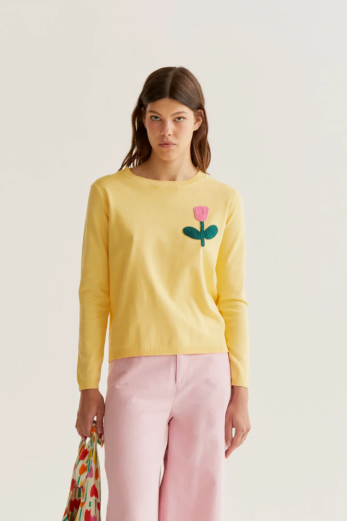 Jersey punto amarillo con bordado de tulipán rosado