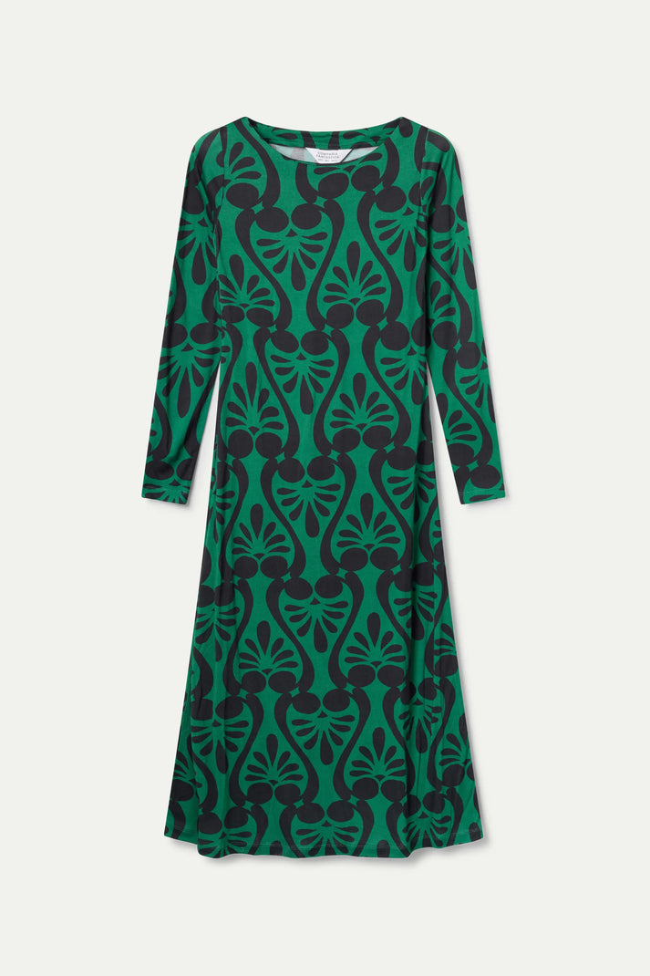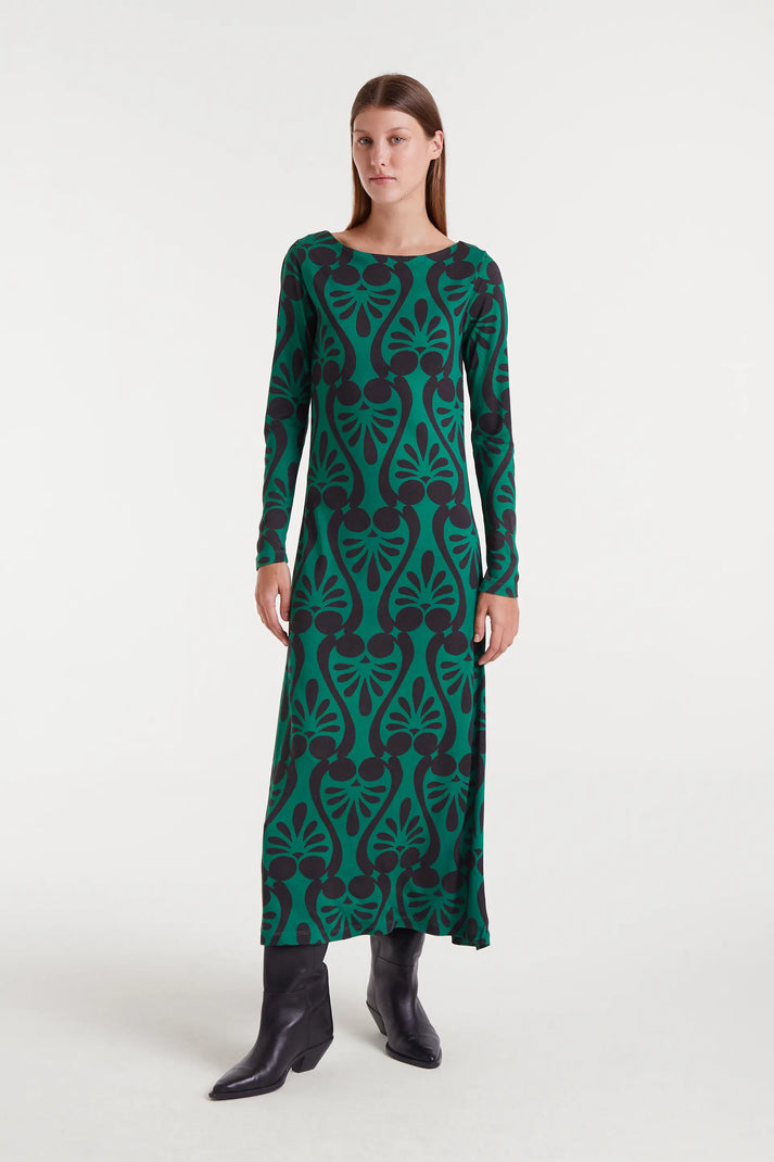 Vestido largo de color verde con estampado Baroque. Con cuello barco y manga larga. La modelo de mide 177 cm y lleva la talla S.