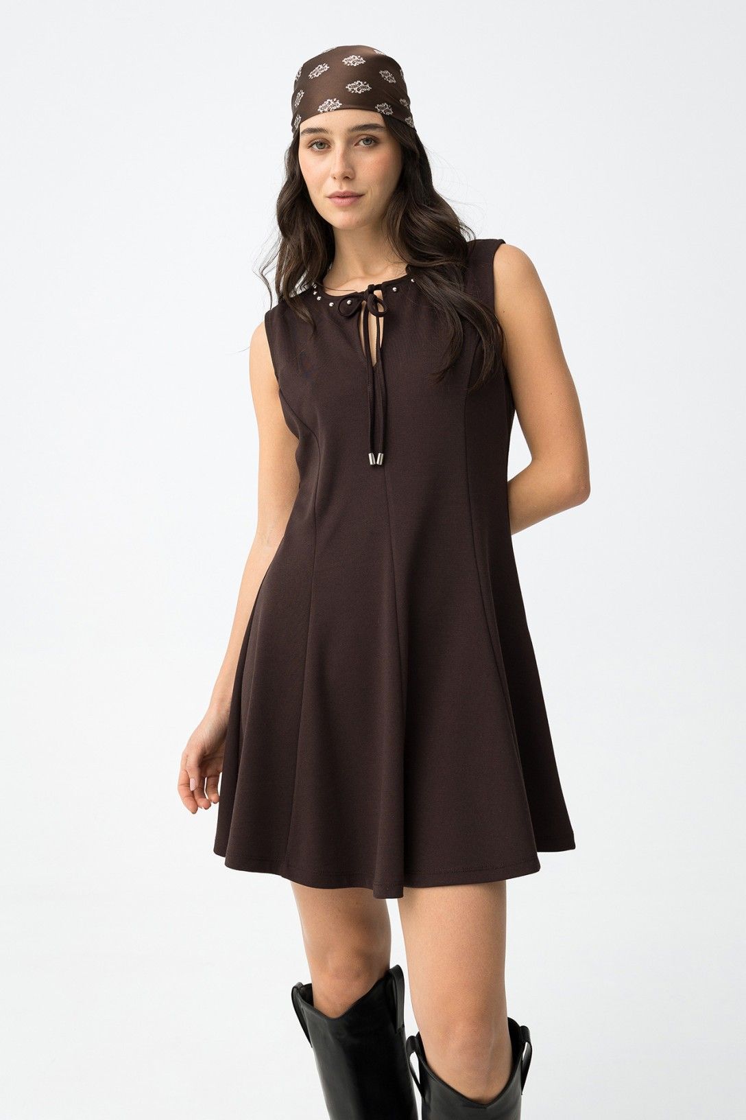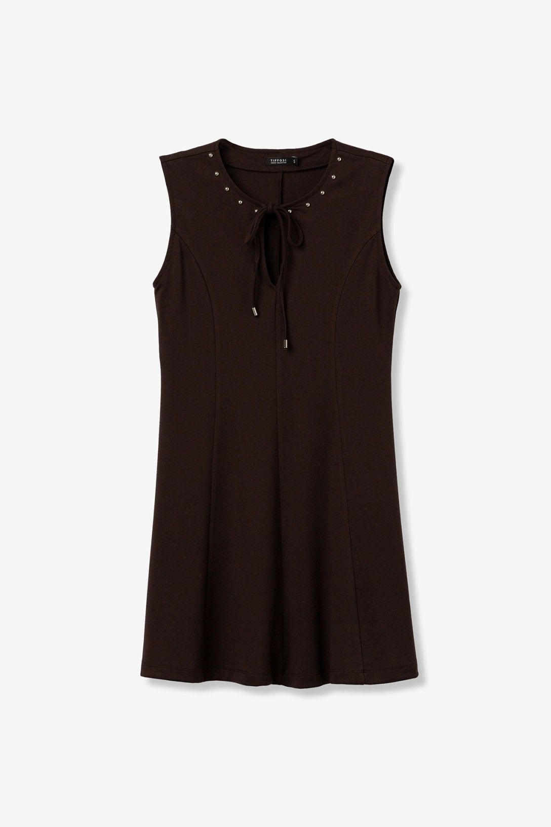 vestido en tejido Antelina marrón chocolate con corte evasé , lazada al cuello y tachuela 80% POLYESTER 15% VISCOSE 5% ELASTANE